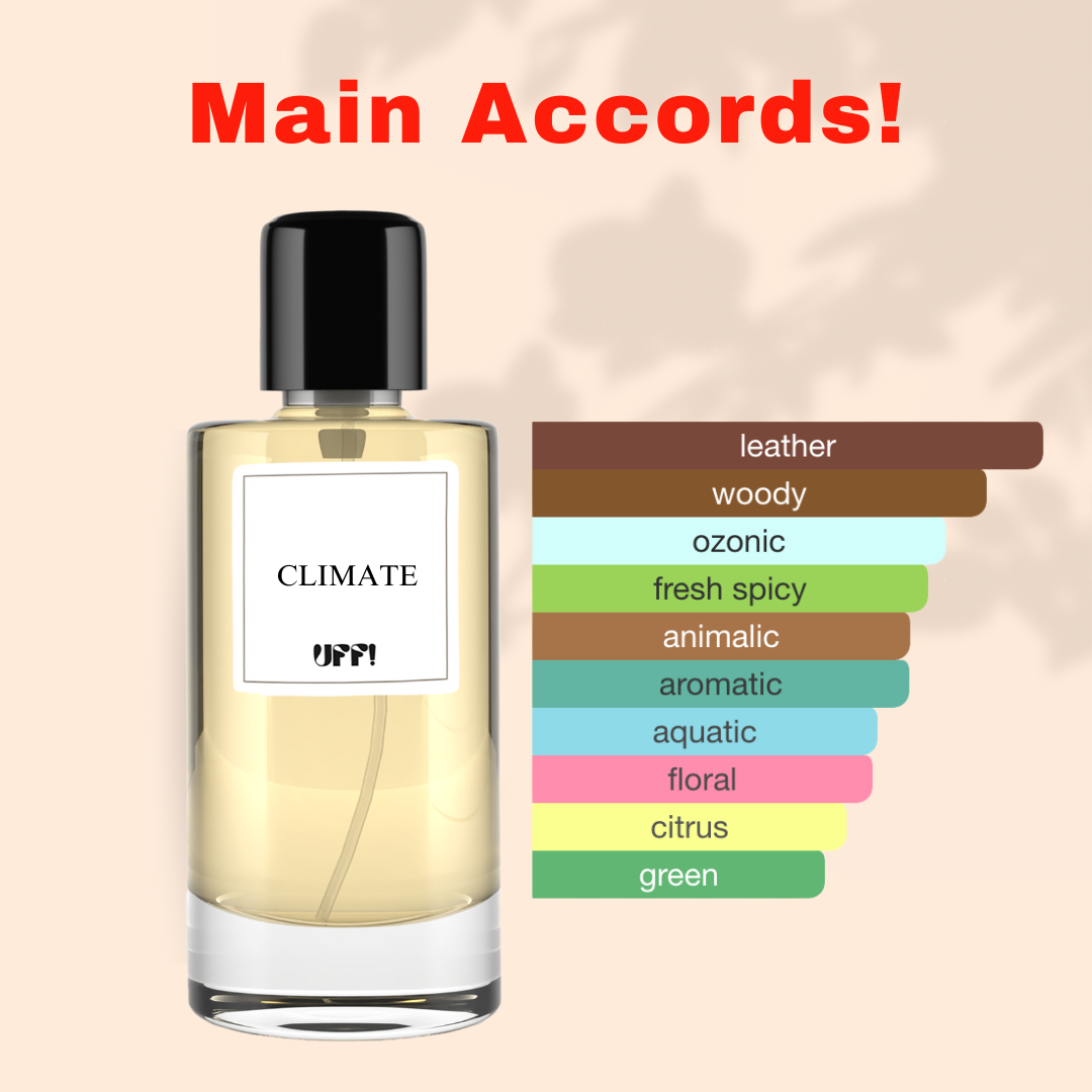 CLIMATE has blending fresh citrus, spicy nutmeg, and leathery accords with a smoky woody base for a bold and masculine scent.