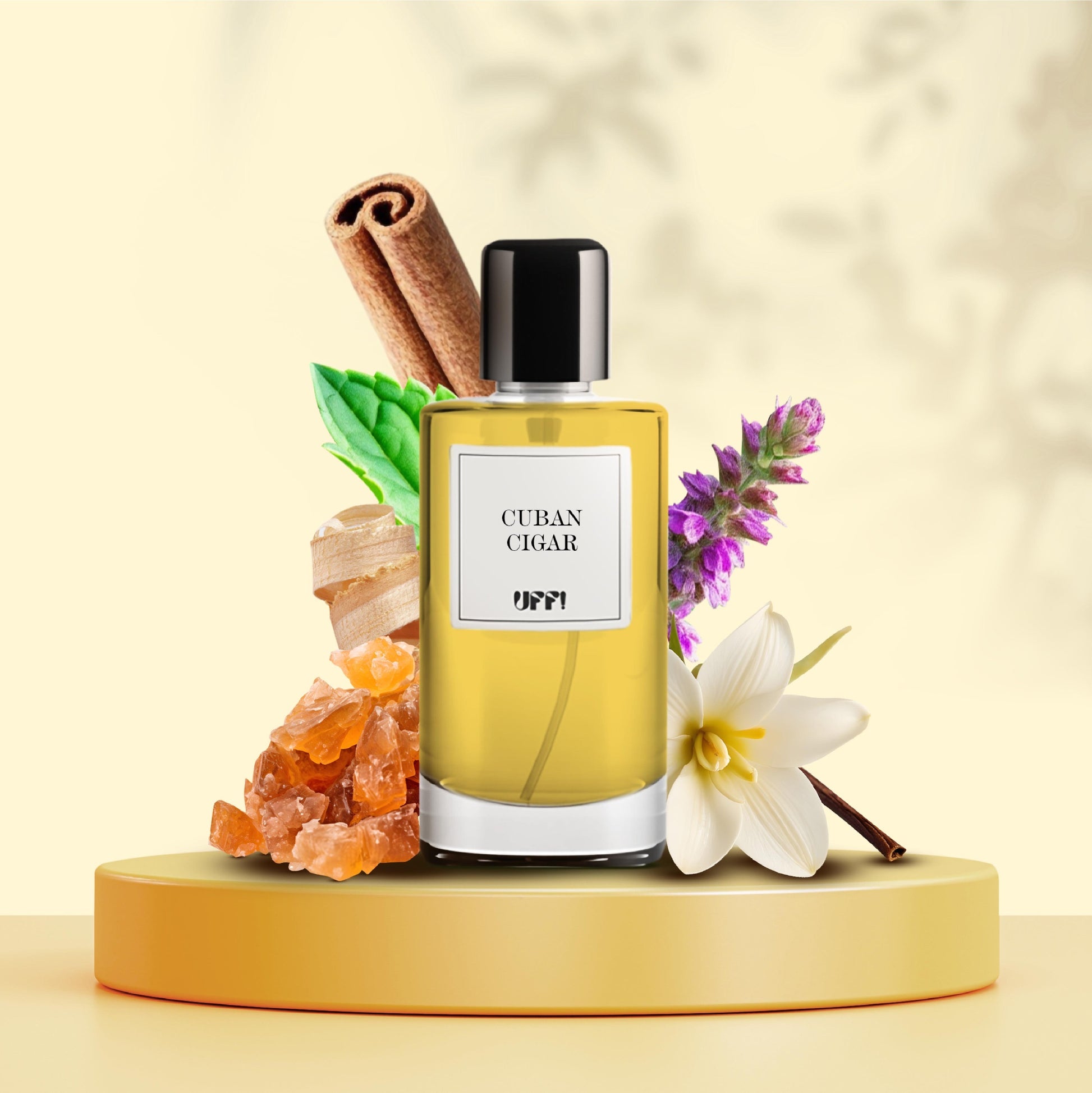 Cuban Cigar perfume blends rich tobacco and oud with spices and vanilla, creating a luxurious, smoky, and warm fragrance that exudes sophistication and depth.
