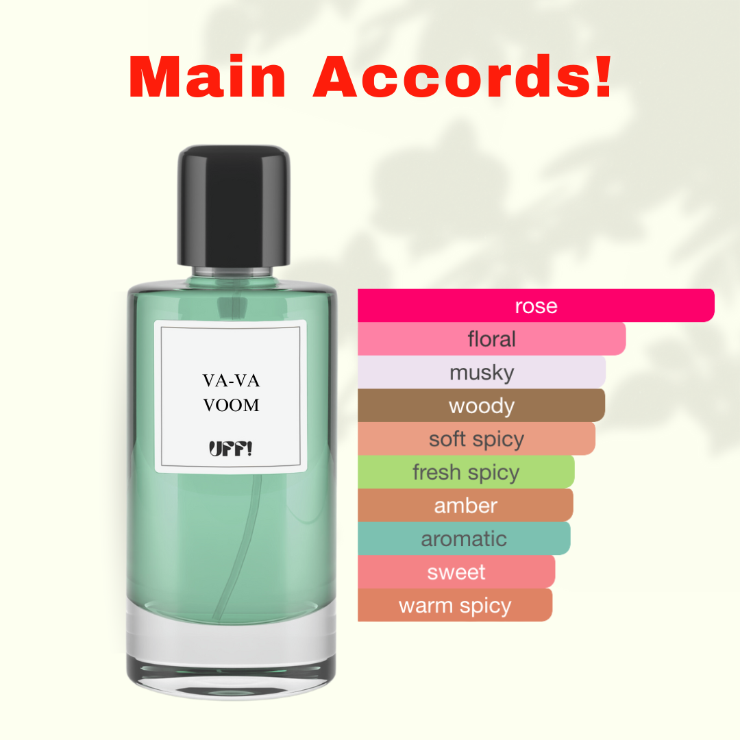 Va-Va-Voom perfume presents a playful yet sophisticated blend of spicy pink pepper, elegant rose, and woody vetiver, offering a unique, modern, and charismatic scent experience.