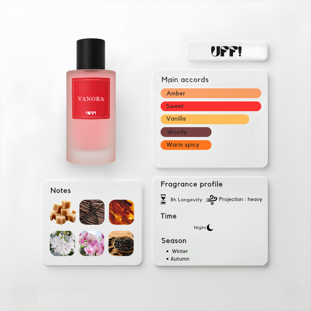This is not a simple vanilla; it is a rich, nuanced, and deeply sensual experience. VANORA is a masterful blend of sweet and warm notes, designed to be both comforting and utterly captivating. It’s a decadent treat for the senses, perfect for those who want to feel alluring and elegant.
